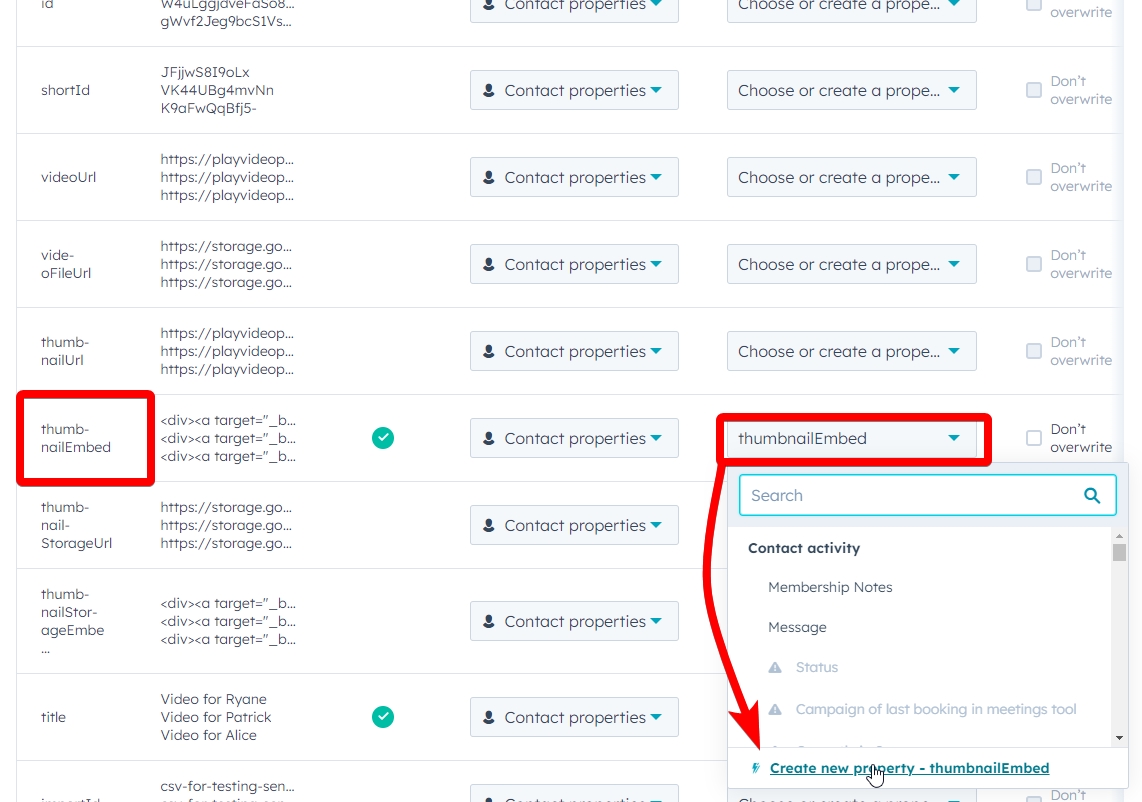 columnUnless you have already created the thumbnailEmbed property on your Contacts in hubspot, click "Create new property - thumbnailEmbed"